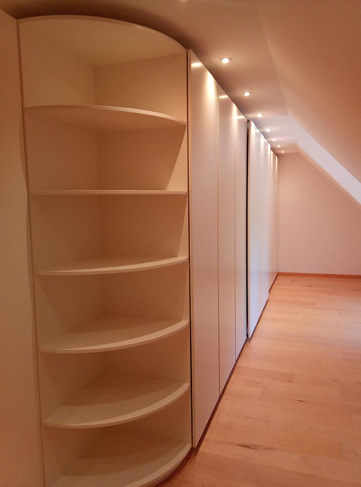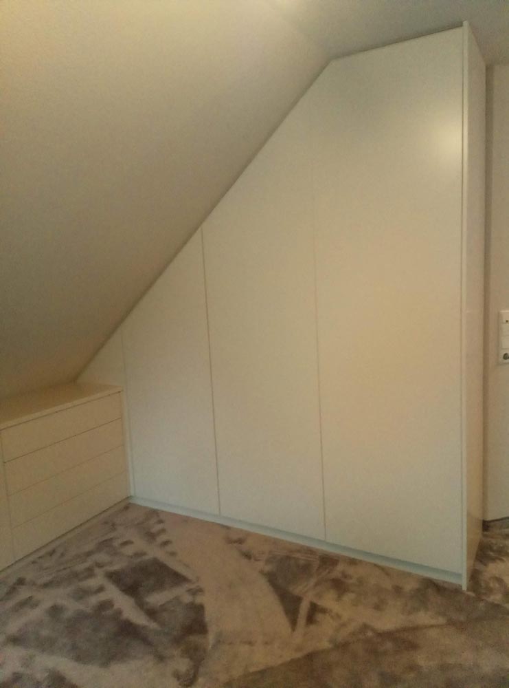Jetzt reicht es! Wir helfen, Ordnung zu schaffen. Lassen Sie sich doch Ihren individuellen Schrank passend zu Ihrer Raumsituation planen. Nutzen Sie die komplette Raumgröße aus, ob Dachschräge oder krummes Maß.